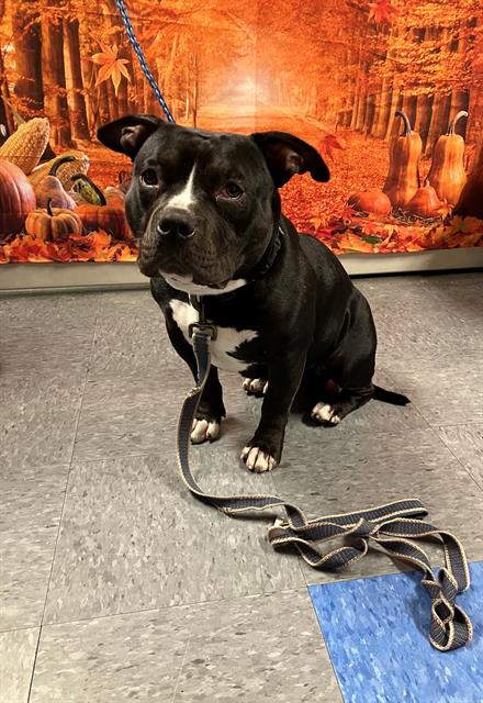 The shelter named me Moose. I am a 2 year old male black & white American Pit Bull Terrier Mix. I have been at the shelter since Thursday, November 20, 2025. Must provide proof of home ownership or landlord approval at the time of adoption.