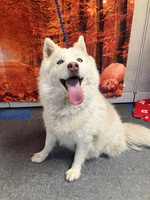 The shelter named me Mylo. I am a 12 year old neutered male white Siberian Husky. I was found not wearing a collar on Hedstrom Rd/Stern Way. I will be available for adoption on Saturday, February 28, 2026. Must provide proof of home ownership or landlord approval at the time of adoption.