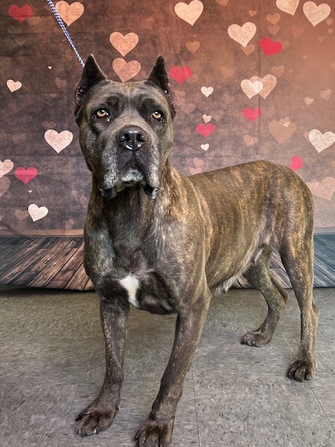 The shelter named me Dahlia. I am a 4 year old spayed female brown brindle Cane Corso Mix. I have been at the shelter since Saturday, January 17, 2026. Must provide proof of home ownership or landlord approval at the time of adoption.