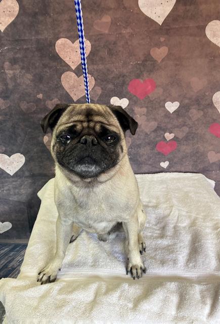 The shelter named me Stanley. I am a 3 year old male cream & black Pug. I was found not wearing a collar on Vermont Ave/Sunnyside Dr. I have been at the shelter since Saturday, February 14, 2026. I will be available for adoption on Saturday, February 21, 2026. Must provide proof of home ownership or landlord approval at the time of adoption.
