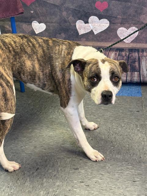 The shelter named me Blossom. I am a 3 year old female brown brindle & white Pit Bull Terrier Mix. I have been at the shelter since Wednesday, March 4, 2026. Must provide proof of home ownership or landlord approval at the time of adoption.