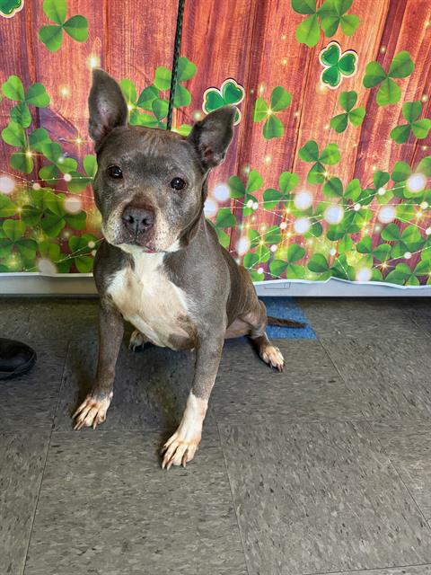 The shelter named me Fynn. I am a 10 month old male gray & white Pit Bull Terrier Mix. I have been at the shelter since Thursday, June 12, 2025. Must provide proof of home ownership or landlord approval at the time of adoption.