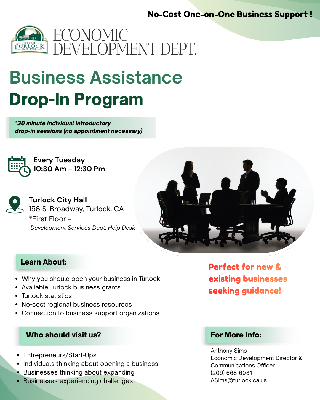 The City of Turlock's Economic Development Department's Business Assistance Drop-In Program - offers no-cost, one-on-one support for both new and existing businesses.Drop in anytime - no appointment needed!