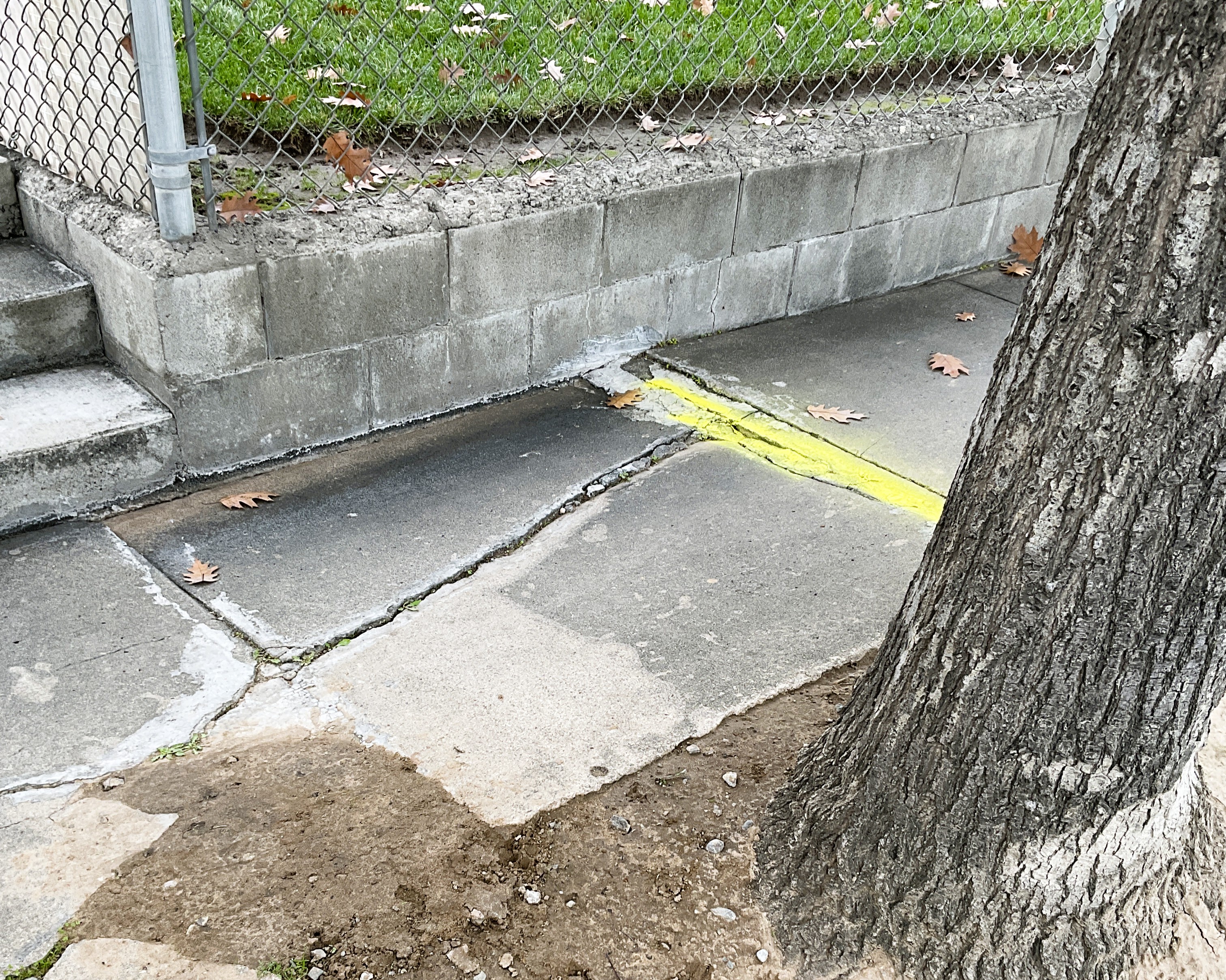 - Vertical displacement where sidewalk panels, curbs, or adjacent hardscape surfaces are raised or settled by more than one-half inch (½") compared to adjoining surfaces.
